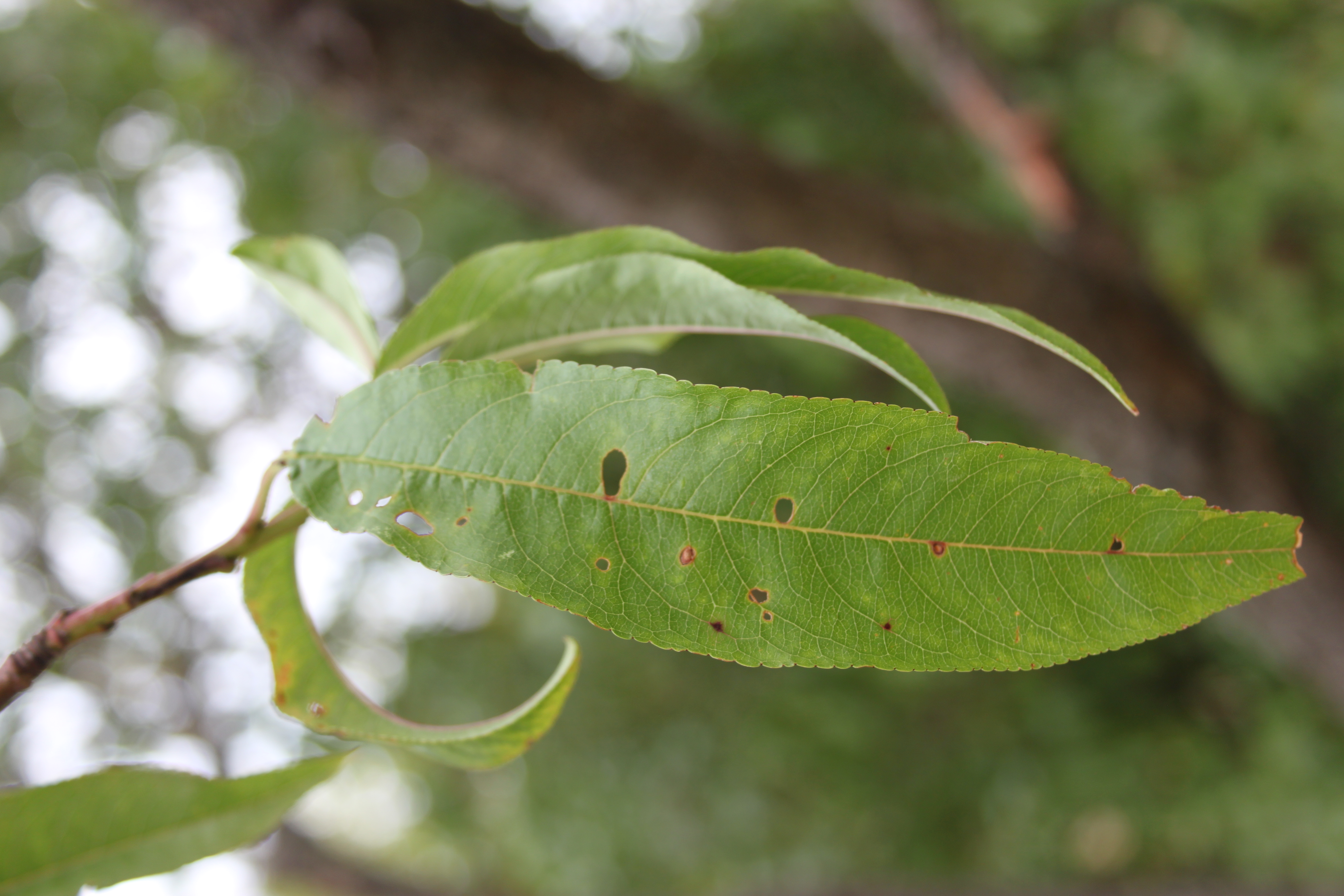 A leveleken kezdetben sötét, lilás színű foltok jelennek meg. A foltok közepe idővel beszárad, és szabályos (általában kör) alakban kiseik a levéllemezből. Mandulán jellegzetes tünet a levélszél karéjossá válása is. A fertőzött levelek gyakran idő előtt színesednek és lehullanak. A tünetek a vesszőkön és a terméskezdeményeken barnás, parásodó foltok formájában jelennek meg.