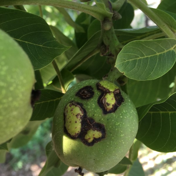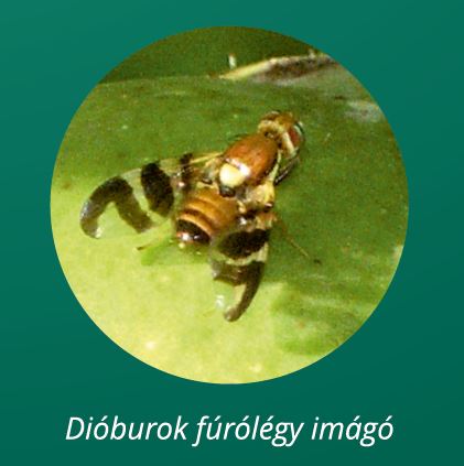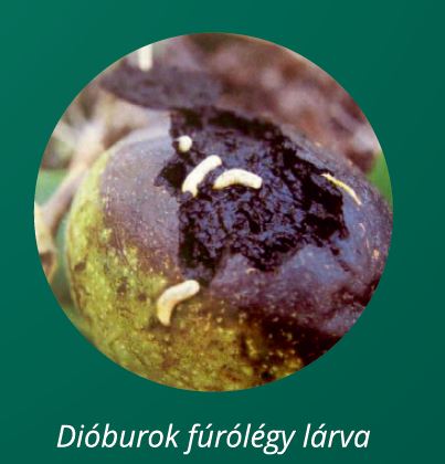 Sajnos sokan megijednek a fekete termés láttán és végül a fa kivágását választják, holott van a levelek még egészségesek és a dióbél is ép. Ellenben ha a levélen is észlelünk tüneteket valószínűleg baktériumos betegséggel állunk szemben, amely ellen rezes készítménnyel védekezhetünk. Visszatérve a dió feketedésére nagy valószínűséggel dióburok-fúrólégy károsította meg a termést. Nálunk nem őshonos fajnak egy nemzedéke van. Július elejétől szeptemberig folyamatosan rakja a petéit. Elhúzódó rajzását nyomon tudjuk követni sárga ragacsoslappal, amelyet a lombkorona felső harmadára kell helyezni. A védekezést a dióburok-fúrólégy ellen FULL 5 CS-sel és SPILAN 20 SG-vel végezhetjük el sikeresen, amit a rajzáshoz kell igazítani. Erre ajánlható a zöldessárga lapok kihelyezése, de ezeket a lombkorona felső részébe kellene kitenni július közepétől és októberig(!) rendszeresen megfigyelni. Ezek a lapok nem szelektívek és a dióburok fúrólégy könnyen összetéveszthető más legyekkel, például a cseresznyelegyekkel is. A zöld burkon az apró szúrásnyomok jelzik a tojásrakást. A lárvák augusztus elején kelnek ki. A termés barnul, elfeketedik, majd idő előtt lehull az étkezésre teljesen alkalmatlan dió. Védekezni lehet talajtakarással, mert az így lehullott termésből a dióburok-fúrólégy lárvái nem tudnak bebábozódni a talajban. Emellett a károsított termést érdemes összegyűjteni, majd megsemmisíteni.