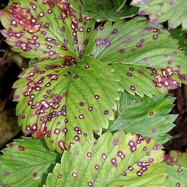 Kórokozók közül a mikoszferellás levélfoltosság is megjelenhet földi eprünkön. Ennek tünetei a képen is látható apró foltok a levélen. A foltok idővel összeérnek és a levél elszárad. A levélnyélen és a csészelevélen is megjelenhetnek. A beteg növényi részekről fertőz, így azokat ne hagyjuk az ágyás közelében. Április végétől a hűvös csapadékos időjárás alkalmával kezd terjedni. Vegyszeresen virágzás előtt és szüret után védekezhetünk ellene. (Hydrostar, Meteor, Signum WG)