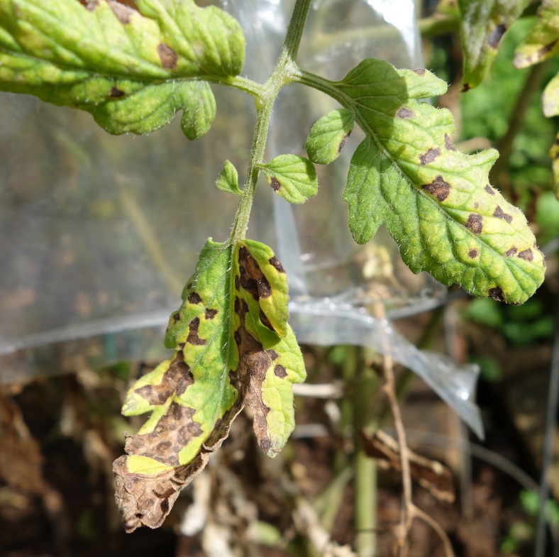 A paradicsom legsúlyosabb kórokozója. Megtámadhatja a leveleket, a szárat és a termést is. Az idősebb levelek szélétől indulnak a tünetek, amik kezdetben sárgás, világoszöldes foltok, majd ezek barnává válnak, nagyobbak lesznek, és a levél elszárad. A bogyókon megjelenő foltok körkörösen mintázottak, a paradicsom húsába mélyedő és kemény tapintásúak.